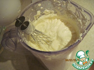 Тоненькой струйкой вливаем в крем распущенный желатин, продолжая взбивать, вот такой крем получается.