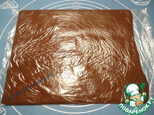 Перекладываем шоколадную смесь в полиэтиленовый пакет, распределяем скалкой ровным тонким слоем (чем тоньше будет слой, тем нежнее будет шоколадный рисунок) и помещаем в морозильную камеру.