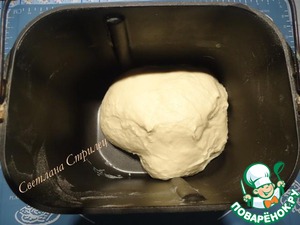 Теперь приготовим тесто: я помещаю все ингредиенты для теста в ведерко для хлебопечки - просеянную муку, сахарный песок, соль, теплое молоко, дрожжи, яйцо, размягченное сливочное масло. Тесто замешиваем с помощью хебопечки. Если у Вас нет хлебопечки - не беда, нужно тщательно вымесить тесто руками.