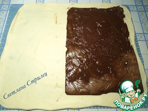 Достаем из морозильной камеры шоколадную прослойку, быстро разрезаем пакет и удаляем, кладем прослойку на половину раскатанного теста.