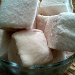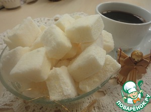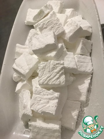На стол или раздел. доску посыпаем оставшуюся смесь крахмал + пудра и выкладываем маршмеллоу верхом вниз.