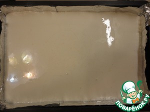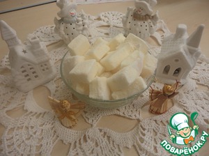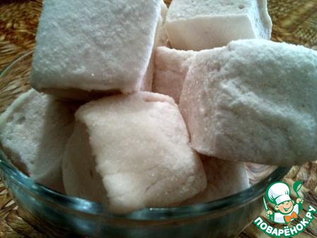 В глубокую форму выстилаем фольгу, смазываем раст. маслом (самую малость). Смешать сах. пудру и кук. крахмал. Дно формы посыпать 3 ст. л. этой смеси. Вылить маршмеллоу-массу. Распределить равномерно и отправить в холодильник на 6 часов ( а лучше всего это делать на ночь). Сверху желательно прикрыть (у меня была большая разделочная доска).