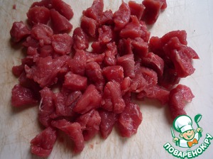 Мясо порезать на маленькие кусочки.