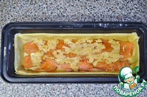 Раскатываю тонко тесто, выкладываю его в форму. Кладу филе. Смазываю соевым маслом.