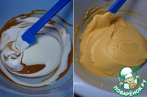 Взбить сливки 150 г, также при помощи лопатки аккуратно добавляем в крем. Крем убрать в холодильник на 20-30 минут, он немного застынет, так проще будет с ним работать.
