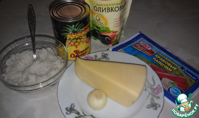 • В чашку сложить рис, ананасы, сыр, крабовые палочки, лук. Добавить майонез. Хорошо перемешать.