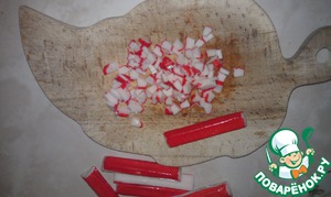• Крабовые палочки порезать мелкими кусочками.