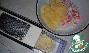 • Сыр натереть на мелкой терке. Граммов 50 оставить на украшение.