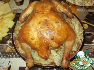 Ставим курочку запекать в духовку (180 градусов) на 1час 30 минут. А пока она готовится, можно заняться приготовлением салатов или наведением красоты. Вот так выглядит готовая курочка. Аппетитно, не правда ли?!