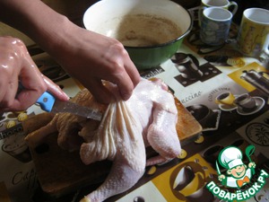 Теперь нам надо подготовить курочку для маринования. Делать это надо следующим образом. Аккуратно, чтобы не порвать куриную кожицу, засовываем руки под кожу и разглаживаем, надрывая связки, связывающие кожицу с тушкой, Делаем это с брюшком и спинкой, захватывая ляжки, крылышки можно не трогать.