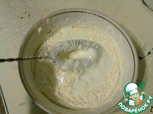 Замешиваем тесто: 6 столовых ложек сметаны, добавить 2 ст. л. масла подсолнечного, 1 чайную ложку соды (не гасить), соль по вкусу (я беру где-то 1/4 ч. л.) и 1 стакан муки. Все смешиваем, тщательно растирая комочки. Тесто должно получиться жидковатое.
