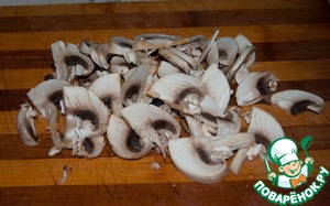 Шампиньоны разрезать пополам и каждую из частей тонко нарезать.