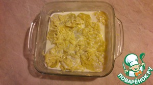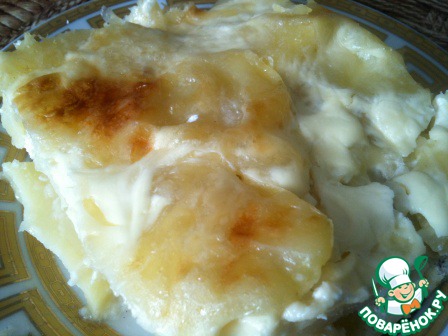 6. Еще один слой картошки, сыра и сливок. Залейте немного молока, в котором готовился картофель.
