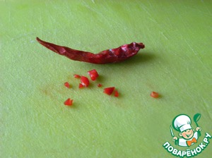 Красный перчик измельчить и добавить в сковороду, всыпать имбирь.