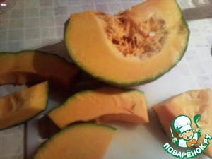 Отправляем почищенную и разрезанную на кусочки тыкву к луку и морковке. Количество тыквы зависит от вашего желания (чем больше тыквы, тем гуще суп).