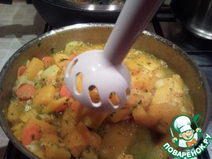 Теперь все совсем просто. добавляем половник бульона из чечевицы к овощам, чтобы сделать массу пожиже.