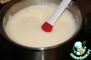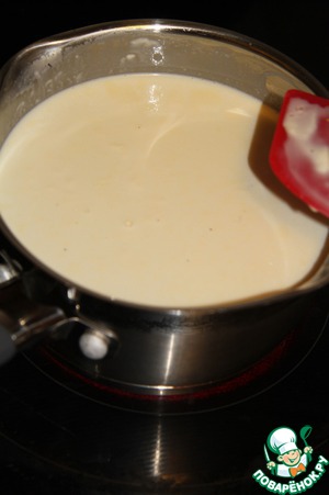 Дальше мы вынимаем стручок ванили и начинаем вводить молочную смесь в желтки по одному половнику, не переставая при этом взбивать желтки. Возвращаем смесь на плиту, ставим на медленный огонь и варим до состояния супа-пюре. У меня это заняло около 5 минут.