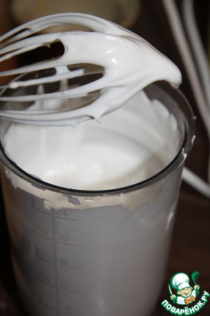 Для приготовления меренги взбиваем белок с щепоткой соли и соком лимона, постепенно вводим сахар. Масса должна получиться устойчивая.