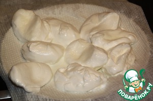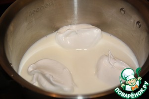 Оставшееся молоко наливаем в кастрюлю и ставим на плиту. Молоко закипает и мы отправляем в него 3 полные ложки меренги. Варим около 1 минуты, 30 секунд с одной стороны и 30 с другой.