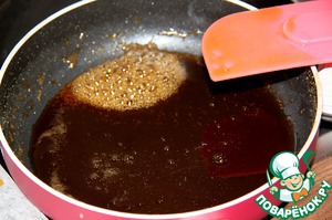 На сковороде соединила 100гр. сахара и 100мл. воды. Сварила густой карамельный сироп.