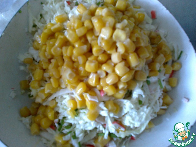 Ну, начинаем, как я уже писала, капусту я брала пекинскую, мелко нарезала ~250-300 грамм, слегка перетерла с солью, добавила крабовые палочки (опять же грамм 200), 1/2 банки кукурузы и меленько нашинковала зеленый лук и укроп.