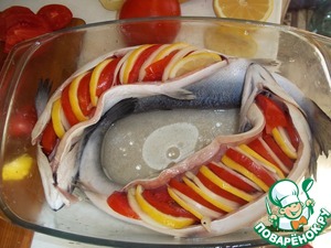 Затем уложить рыбу в емкость для запекания и полить по ложке масла в брюшко - горбуша суховата. Укладываем нарезанные овощи, соблюдая очередность - лук, лимон, помидор.