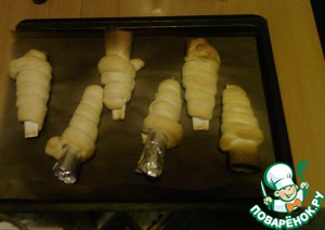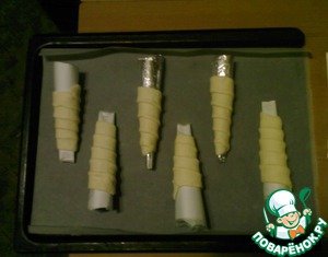 Теперь на эти формы надо намотать размороженные ленты теста. Чтобы получились полноценные трубочки, полоски надо очень хорошо потянуть. Тогда они станут длиннее, тоньше и уже. На упаковке фабричного теста написано, что его нельзя раскатывать, только растягивать. Вот мы с мужем честно вытягивали, он ещё как-то хитро умудрился концы этих полосок заправить - трубочки получились вполне нормальные.