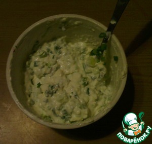 Делаем крем: размягчённое сливочное масло растираем с "Парижской бурёнкой" и творогом. Добавляем нарезанный зелёный лук и измельчённые грецкие орехи. НЕ солим!