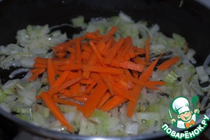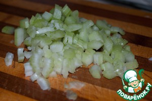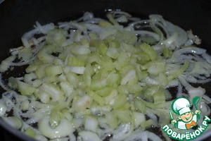 Выложить лук. Как только он схватился температурой, добавить сельдерей.