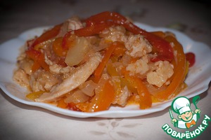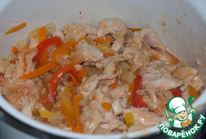 Если в сковороду, где у вас тушатся овощи, поместится полностью все мясо, а также недавно приготовленный соус, то продолжайте процесс приготовления в ней же. Если нет, используйте более глубокую емкость, в которую следует переложить овощи. Добавить к ним кусочки ананаса, а также курицу.