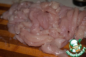 Куриное филе разрезать вдоль, чтобы получились 2 тонкие пластины мяса.