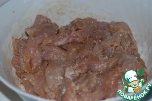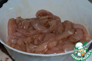 Заправить курицу соевым соусом и мелко натертым имбирем.