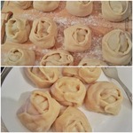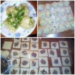 Тесто тонко раскатываем, делим на полоски одинаковой ширины, полоски делим на ромбики, на серединку ромбика выкладываем 1-2 чайные ложки начинки и залепляем противоположные края, а затем соединяем их.