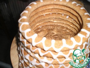 Тем временем готовим глазурь. Это самый обыкновенный королевский айсинг. Смешиваем 150 г сах. пудры (это примерно 1 и 1\3 стакана), 1 белок и 1 ч. л. лимонного сока. Глазурь должна быть довольно густой. Я сделала жидковатой и она у меня немного "потекла", когда стала ее наносить. Если вам кажется, что жидко, добавьте еще сахарной пудры. Перекладываем глазурь в пластиковый пакет, прорезаем крошечную дырочку (1-1.5мм). И начинаем собирать наше "сооружение". На самое большое кольцо волнообразным рисунком (так же примерно, как наносится рисунок черепичной крыши на пряничный домик), наносим глазурь. Кладем сверху кольцо чуть поменьше. -