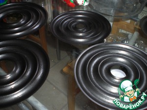Но это лакомство можно испечь и без формы. Просто нарисовать на пергаменте круги, начиная с диаметра 18 см, каждый последующий круг на 0.5 см меньше предыдущего. Тесто получается очень густое, как на печенье, по противню оно вряд ли растечется. Единственное, что форма делает печеньку выпуклой с обеих сторон. Если печь на противне, то одна сторона будет плоская, но это скажется только на высоте конечного изделия. -