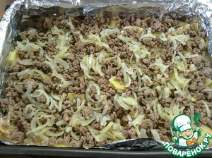 Теперь фарш. Выкладываем на картофель и распределяем по всей поверхности.