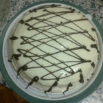 Когда крем полностью застынет, удалить бортик, аккуратно снять полоску бумаги и переложить торт на блюдо.