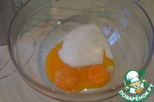 Желтки взбить добела с половиной сахара. Добавить ванильный сахар и перемешать.