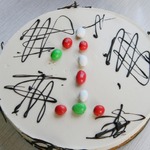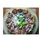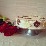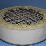 1/4 плитки черного шоколада растопить на водяной бане. Обмакнуть несколько миндальных орешков и выложить их на торт. Остальной шоколад поместить в корнетик и нанести на торт узор. Дать шоколаду застыть в прохладном месте.