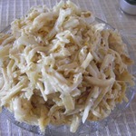 Сыр трем на крупной терке, стараясь, чтобы тоже получалась длинная соломка (т. е. не мельтешим, а совершаем широкие движения рукой :) ) -