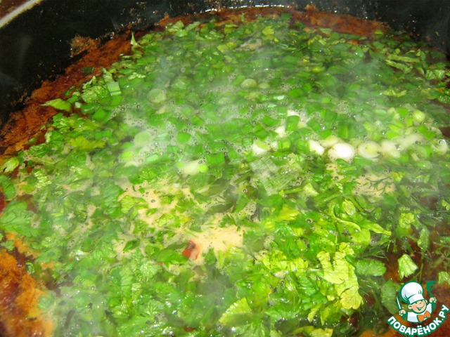 Когда картофель будет готов, кидаем в казан нашинкованную зелень. Казан выключаем. Даём настоятся 10 минут.