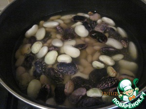 • Для начала замочим фасоль в воде и оставим на ночь, утром промоем чистой водичкой и отварим до готовности. Лучше, конечно, брать фасоль покрупнее, так она будет лучше смотреться в пироге. У меня был микс из мелкой белой и крупной темной и светлой фасоли.