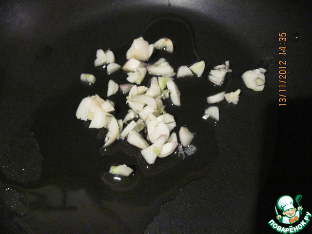 • 3-4 зубчика чеснока измельчаем и слегка обжарим в небольшом количестве растительного масла.