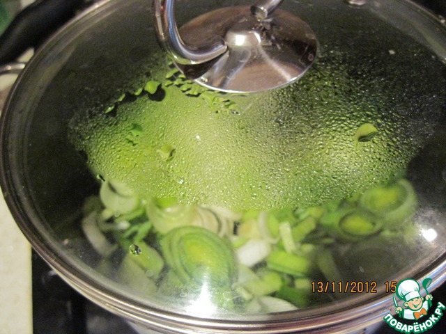 • Порей режем на тонкие полукольца и слегка притушиваем на сковороде на маленьком огне под крышкой до мягкости, можно добавить капельку растительного масла, чтобы не пригорел.