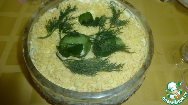Украсить зеленью и розочками из тонких ломтиков вареной моркови и огурца (огурец предварительно посолить и выдержать 10 минут, затем сполоснуть и обсушить ломтики, они станут мягкими и гибкими.). Дать салату настояться в холодильнике пару часов.