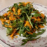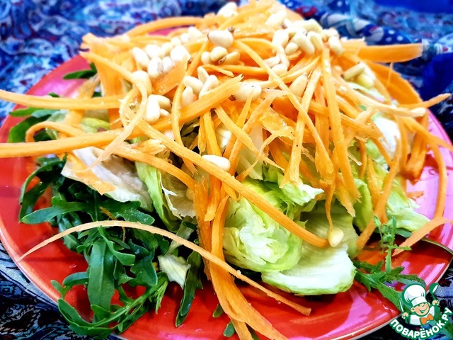 В большой миске соединить морковь, рукколу и цикорий. Посыпать кедровыми орешками.