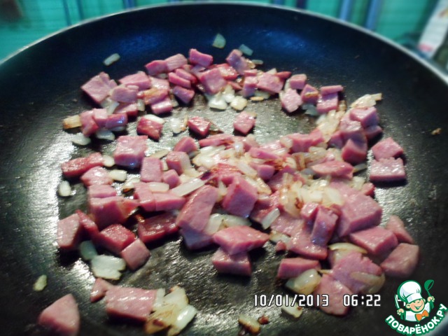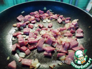 Второе: пассеровка лука в небольшом количестве масла и добавление ветчины.