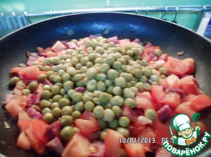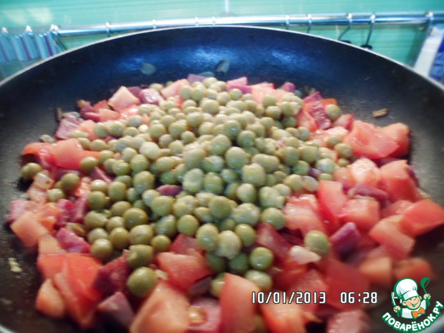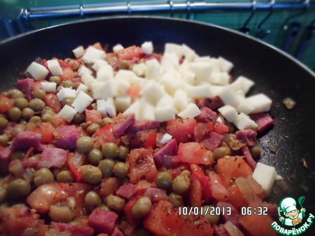 Порезанные помидоры и горошек отправляются к луку. Тушим минут 5 и отставляем немного остывать, чтобы сыр не сразу расплавился.