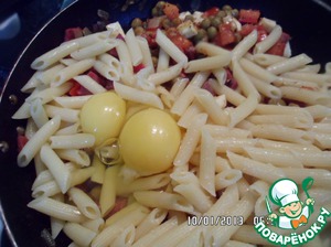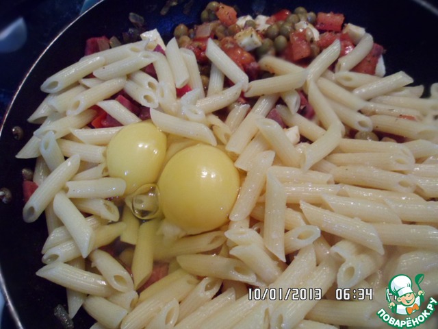 Тем временем наши макароны сварились, промываем их холодной водой и добавляем в овощи. Солим, перчим и обязательно добавляем орегано, оно к этим продуктам особенно хорошо. Не забываем и про яйца.