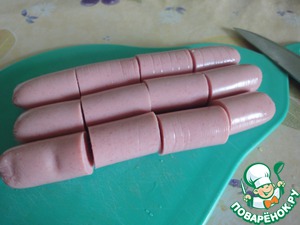 Далее режем сосиски. Т. к. у меня ганноверские, а они достаточно длинные, я режу их на 4 части. Обычные сосиски, я думаю, надо резать на части 2-3. Примерно должны получиться вот такие кусочки.